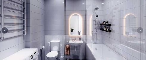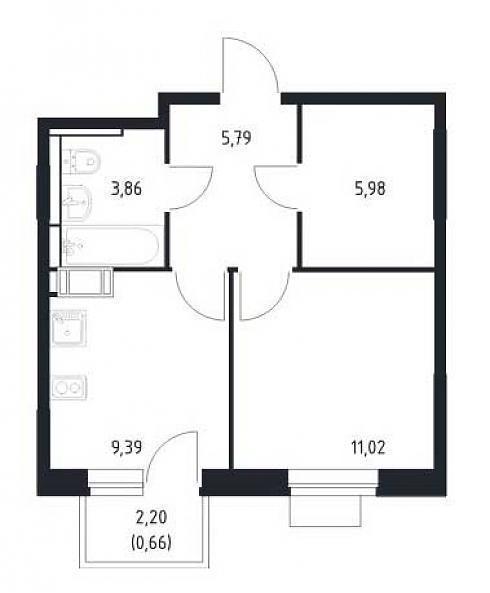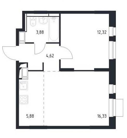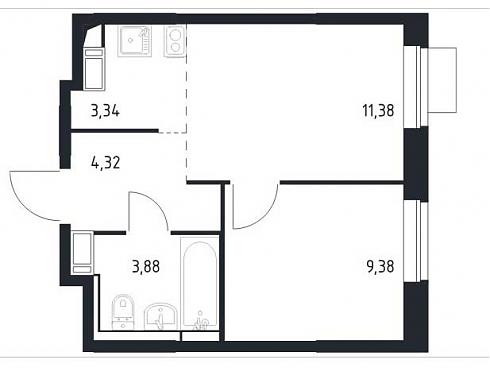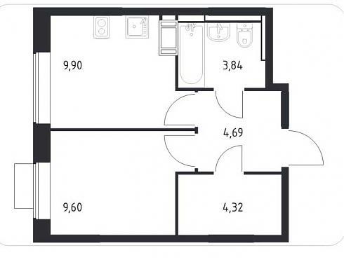 Однокомнатные квартиры располагают входной зоной площадью от 4,62 до 5,79 кв.м., совмещенным санузлом площадью от 3,86 кв.м., кухней площадью от 9,3 до 22,3 кв.м., спальней площадью от 9,6 до 12,32 кв.м. Встречаются гардеробные площадью от 4,32 до 5,98 кв.м. и балконы площадью 2,2 кв.м.