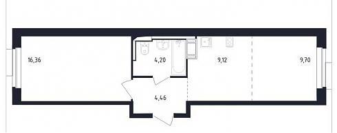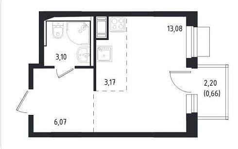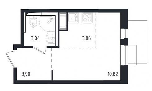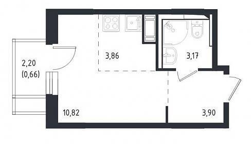 Планировка студий проста. Входная зона площадью от 3,9 до 6,7 кв.м., санузел площадью от 3,04 до 3,17 кв.м., универсальное помещение площадью от 14,66 до 16,25 кв.м., в некоторых вариантах планировки встречается балкон площадью 2,2 кв.м.