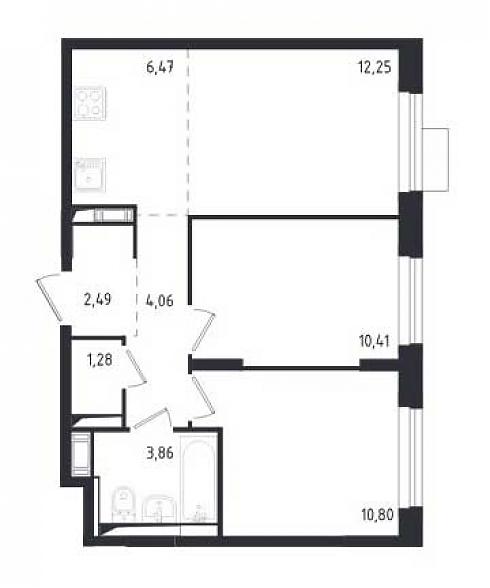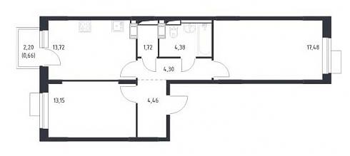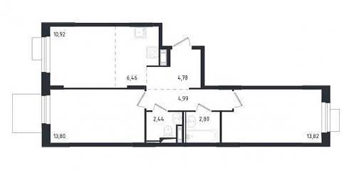 Двухкомнатные квартиры спроектированы как в классическом формате, так и в формате евро. Они оснащены входной зоной площадью от 4,32 до 8,76 кв.м. (с учетом внутреннего коридора), совмещенным санузлом площадью помещений от 3,88 до 4,38 кв.м., кухней площадью 13,72 кв.м. или кухней-гостиной в евро планировке площадью от 14,72 до 18,82 кв.м., одной или двумя спальнями с площадью помещений от 9,38 до 17,48 кв.м. Встречается балкон площадью 2,2 кв.м. Расположение окон одно- или двухстороннее.