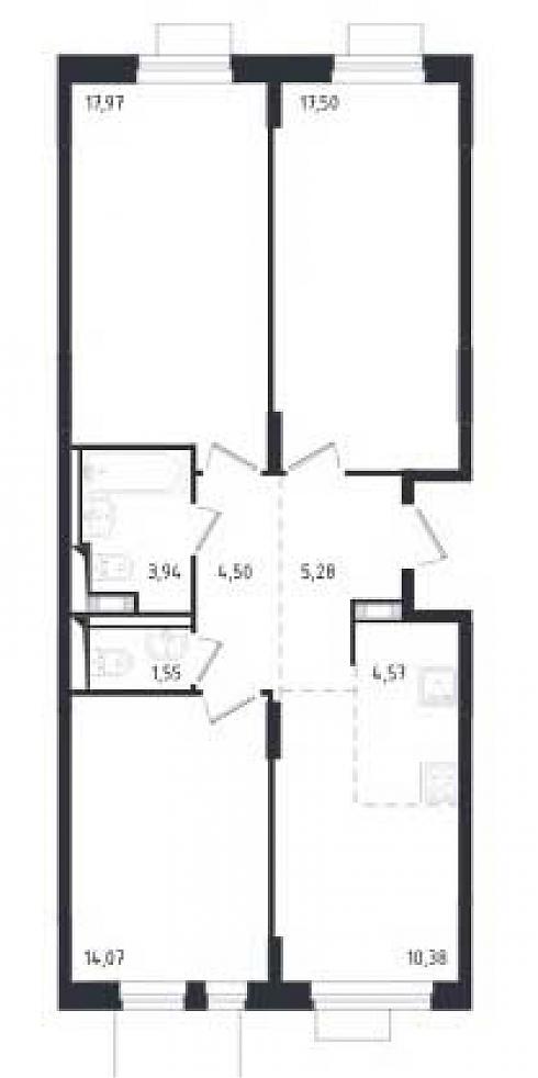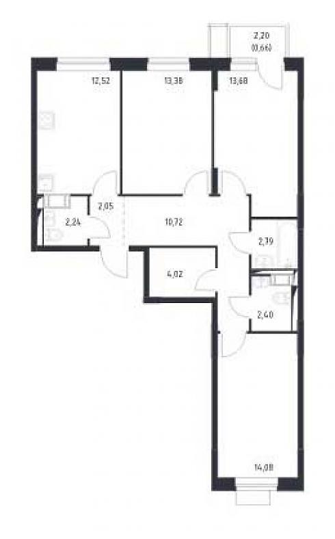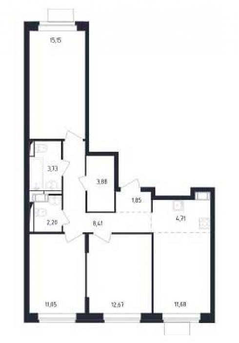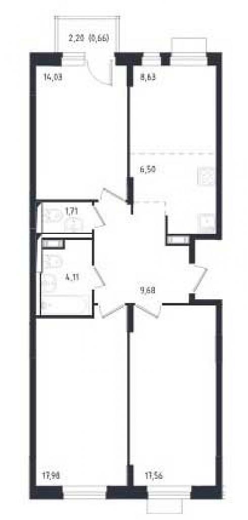 В трехкомнатных квартирах встречаются входная зона площадью от 6,55 до 13,77 кв.м. (с учетом внутреннего коридора), один, два или три санузлас площадью помещений от 2,24 до 3,86 кв.м., кухня площадью 12,52 кв.м. или кухня-гостиная в евро варианте площадью от 16,38 до 18,82 кв.м., две или три спальни площадью от 10,41 до 14,08 кв.м. В некоторых вариантах запроектированы гардеробные площадью 1,28 до 4,02кв.м. Расположение окон одно- или двухстороннее.