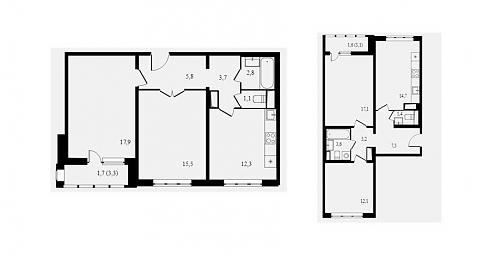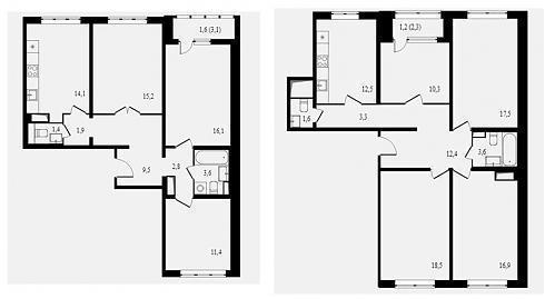 Трех- и четырехкомнатных квартир – по одной планировке, обе распашные. В этих квартирах уже по два санузла.