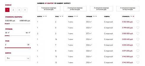 Вполне удобно организован подбор квартир. В таблице выбора по параметрам можно сортировать результаты по любой из позиций. Причем если вы, скажем, рассматриваете только однокомнатные квартиры – то параметры сами «подстроятся» под ваш запрос, показав вам доступные площади и цены.