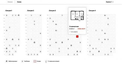 По каждому корпусу можно рассмотреть список доступных квартир либо шахматку.