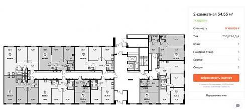 Клик на квартиру выдает сводную информацию и расположение на плане корпуса. Можно также ознакомиться и с поэтажным планом.