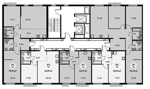 - Корпус №6: 14 этажей, 2 секции, 222 квартиры, 89 кладовых.
