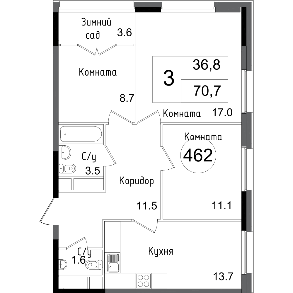 Трехкомнатных квартир всего один вариант (плюс точно такой же в «зеркальном» отображении), где большая комната представляет собой кухню-гостиную с окном и лоджией. В одной из комнат – угловой, два окна. Площади кухонь в трехкомнатных квартирах очень приличные, около 14 квадратов. И здесь, как можно заметить, тоже два санузла.