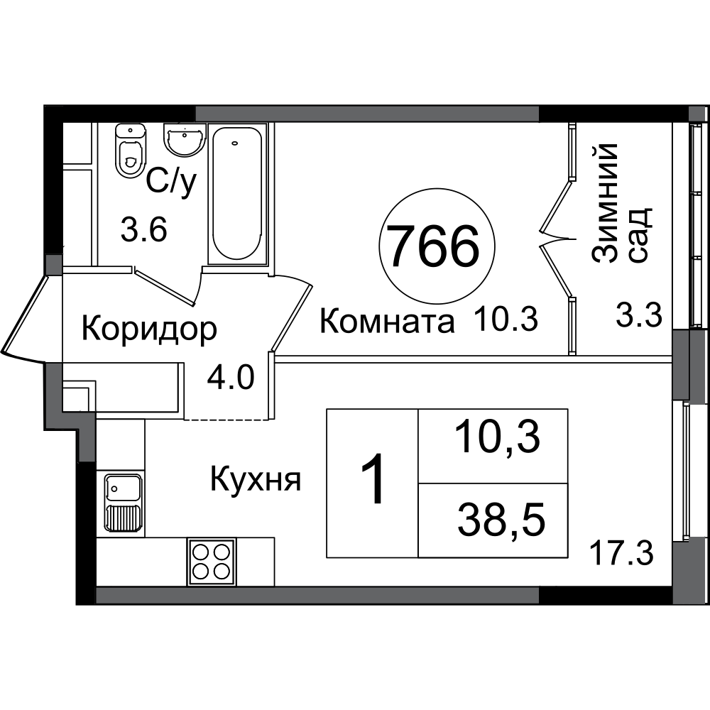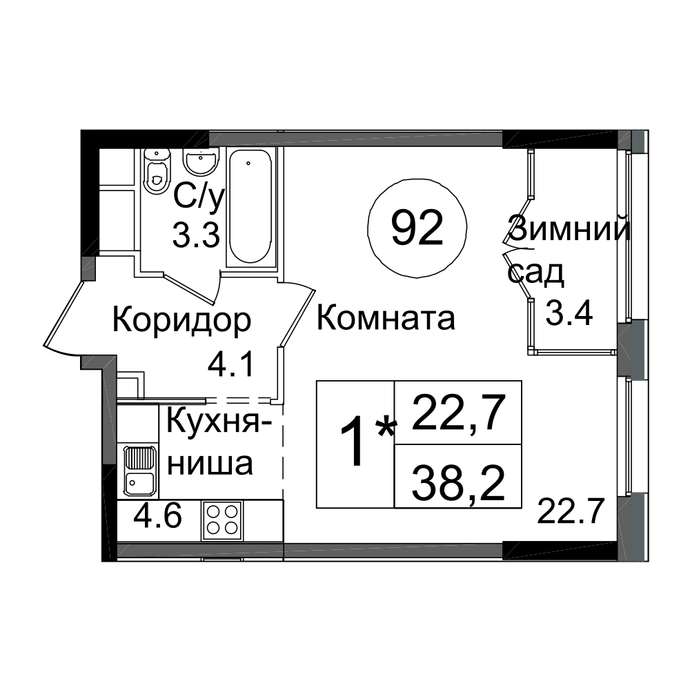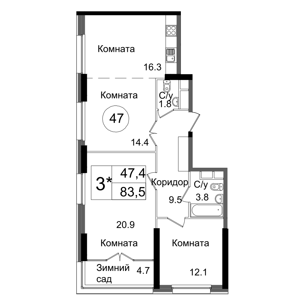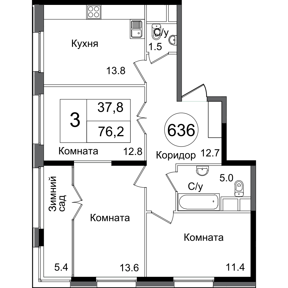Трехкомнатных квартир всего один вариант (плюс точно такой же в «зеркальном» отображении), где большая комната представляет собой кухню-гостиную с окном и лоджией. В одной из комнат – угловой, два окна. Площади кухонь в трехкомнатных квартирах очень приличные, около 14 квадратов. И здесь, как можно заметить, тоже два санузла.