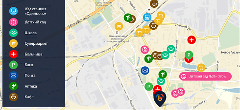 Новостройка находится примерно в километре от ж/д станции «Одинцово» и в 800 метрах от Минского шоссе.