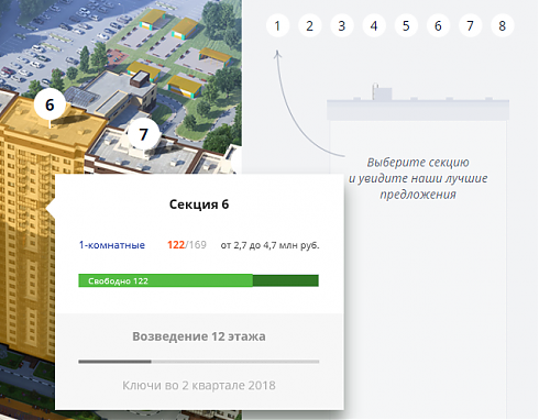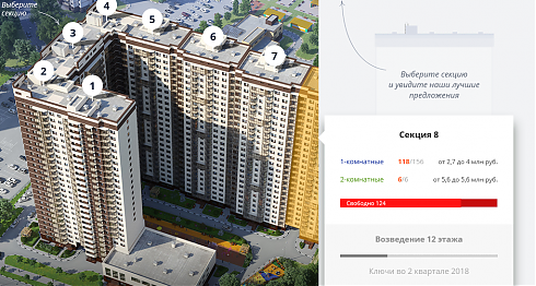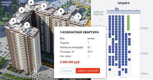 Тут есть все, что может заинтересовать покупателя: выбор квартир, генплан, поэтажные планы, проектная документация, расположение комплекса на карте, инфраструктура района, преимущества, скидки, варианты отделки, условия ипотеки…