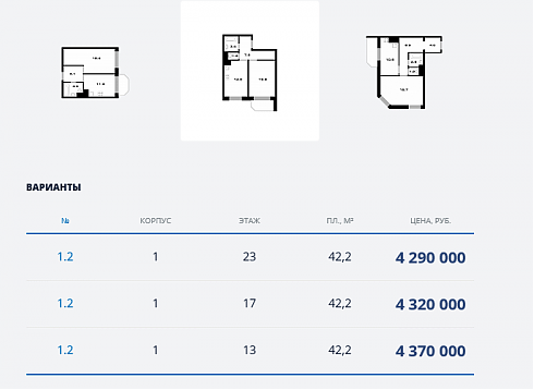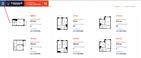 Есть также одно неочевидное меню – оно открывается по клику на три полосы в левом верхнем углу экрана, рядом с логотипом Комплекса. Там можно найти прямую ссылку на фотоотчеты и, самое главное, очень удобную вкладку с планировками. На основной странице планировки тоже представлены, но тут информации больше, и она нагляднее.