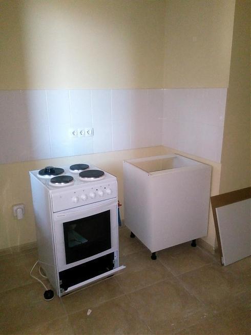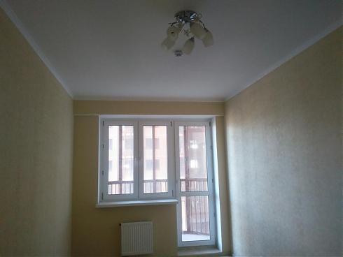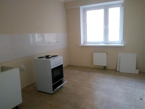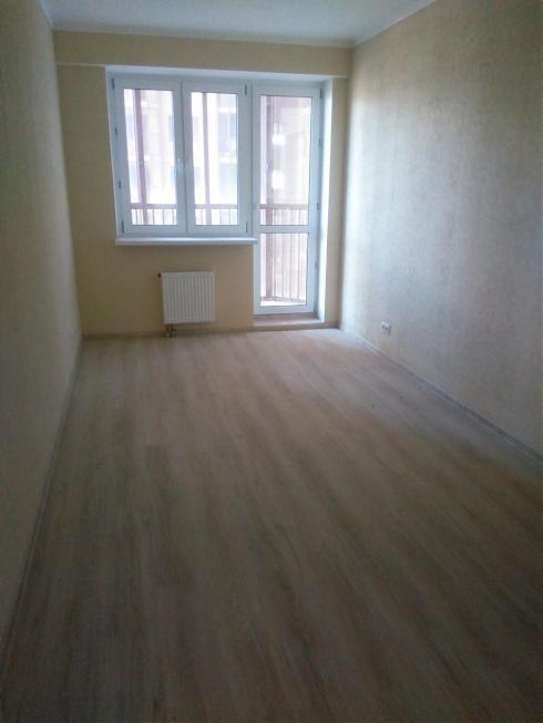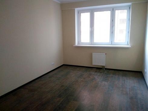 На выбор покупателя есть два варианта цветового решения – темный и светлый (оба, впрочем, достаточно нейтральные, без вычурности). Неплохие межкомнатные двери, красивый кафель в санузле, в кухне довольно простенький белый «фартук» из плитки, обои под покраску с ненавязчивым рисунком, на потолке – побелка, на полу – ламинат.