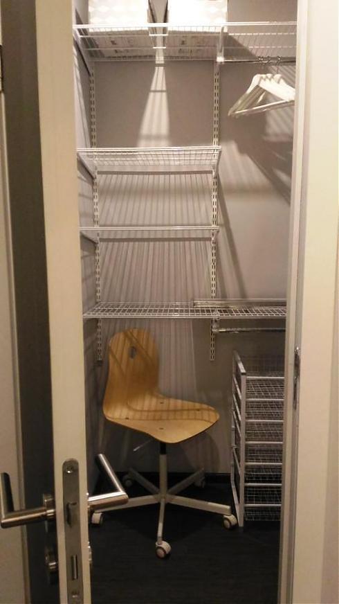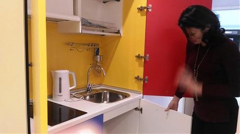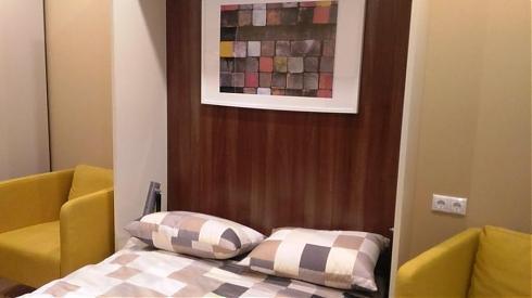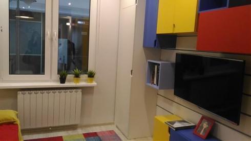 Мария с удовольствием показывает мне модульную мебельную систему, позволяющая быстро менять интерьер. Мебель эта, которую изготавливает российский производитель специально для ЖК, состоит из дивана-кровати, кровати, которая легким движением послушно поднимается и сливается со стеной, письменного столика, который легко превращается в стол для небольшой компании, кухонного набора мебели с холодильником и гладильной доской, который можно закрыть дверцами так, что с виду это будет и не кухня вовсе, а просто стенной шкаф. Все это в двух цветовых решениях: сдержанный, бежево-коричневый, и яркий, желто-красный в стиле пролетарского художника Фернана Леже. В ванной уже установлена сантехника и стиральная машина.