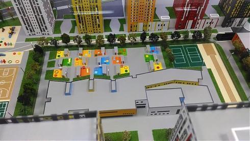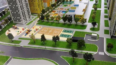 Теперь про дворы без машин. Тут совсем странно: площади для дворов с машинами или без машин просто нет. Посмотрите еще раз на макет. Все пространство между двумя рядами высоток занимают школа, детский сад и прилегающая к ним территория со стадионом для школы и детскими площадками для сада. Все это будет огорожено. Для жителей остаются дорожки, по которым можно пробежаться утром или пройтись с собакой вечерком, и небольшое пространство рядом со школой, где на макете показаны пара спортивных и столько же детских площадок. Строительная компания не обещает забор вокруг них. То есть, в одном офисе мне сказали, что вот здесь и будет забор, а в другой этому вопросу сильно удивились (объясняю: у компании два офиса продаж, но об этом чуть позже). Итак, две детских площадки на девять тридцатиэтажных башен. Правда, детей здесь много не ждут.