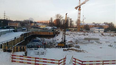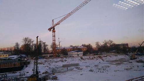 Со второго этажа офиса продаж у станции Павшино хорошо видна стройка первых трех корпусов. Фундамент стилобата уже залит, его присыпало снежком. Морозы не останавливают стройку, она идет полным ходом.