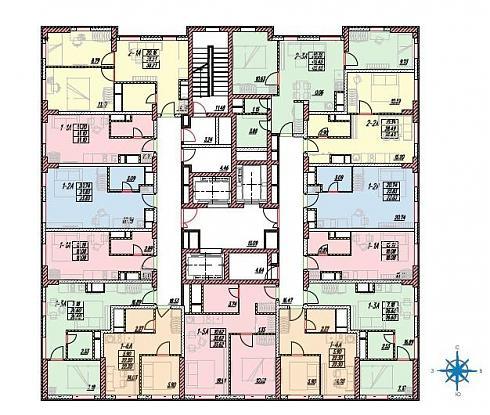 Каждая башня представляет собой прямоугольник в сечении, поставленный точно по сторонам света, в центре два лифта, из лифтовой выходы в два коридора, идущие с севера на юг. В каждом коридоре выходы из шести квартир. Планировка, на мой взгляд, удачная, коридор не будет казаться слишком длинным, хотя сами квартиры небольшие по площади.