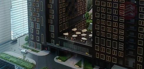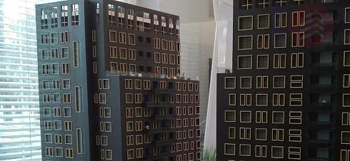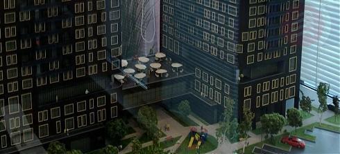 Оба корпуса возводятся по монолитной технологии, стены – кирпичные. Высота потолков в основной массе – 2.8 метра (три метра от потолка до пола, включая перекрытия). Самыми примечательными будут, на мой взгляд, 4 и 19 этажи. Во-первых, потолки тут просто «царские» – 4.3 метра. Во-вторых, на этих этажах будут огромные панорамные окна. В-третьих, в некоторых квартирах предусмотрены террасы. Интересно, что на 4 этаже у террас будет «крыша» в виде 5 этажа, а вот террасы 19 этажа планируется сделать полностью открытыми, без навеса сверху. Вот как это выглядит на макете и визуализациях: