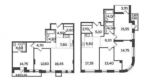 Лоджии или балконы есть в пяти квартирах из семи. В целом, между двумя корпусами заметно сходство, не зря комплекс назвали Twin House (twin – по-английски «близнец»). Например, четырехкомнатная со скругленным углом и там, и там одинаковая:
