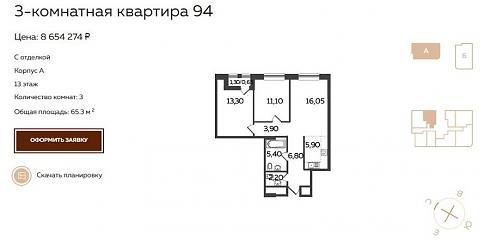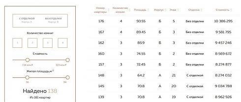 Во втором случае можно выбрать корпус (А – с отделкой, В – без отделки), стоимость, количество комнат и площадь квартиры. Правда, подробной информации об отделке на сайте я не нашла.