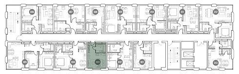 В однокомнатных квартирах запроектирована входная зона площадью от 3,74 до 5,81 кв.м., совмещенный санузел площадью от от 3,58 до 5,13 кв.м., кухня площадью от 13,72 до 14,06 кв.м. и спальня площадью от 14,5 до 18,62 кв.м. Встречаются гардеробные площадью от 3,22 до 5,17 кв.м.