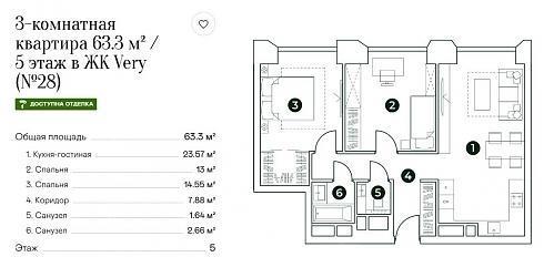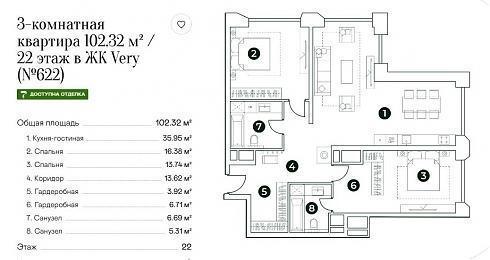 В трехкомнатных квартирах евро-формата находим входную зону площадью 7,36 до 13,62 кв.м., два санузла с площадью помещений от 1,64 до 6,69 кв.м., кухню-гостиную площадью от 23,57 до 35,95 кв.м., и две спальни площадью от 13,0 до 16,44 кв.м.. Встречается гардеробная площадью от 3,66 до 6,71 кв.м. Расположение комнат одностороннее и угловое, встречаются комнаты с двумя окнами.
