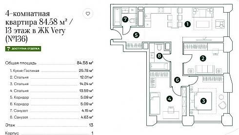 В пятикомнатной квартире евро-формата запроектирована входная зона площадью 17,91 кв.м. (с учетом внутреннего коридора), три санузла с площадью помещений от 3,7 до 4,05 кв.м., кухня-гостиная площадью 39,92 кв.м. и четыре спальни площадью от 13,74 до 16,24 кв.м. Встречается гардеробная площадью 1,76 кв.м. Расположение комнат угловое, встречаются комнаты с двумя окнами.