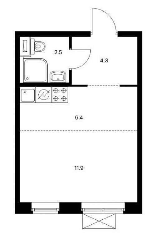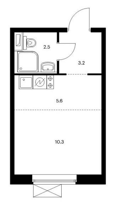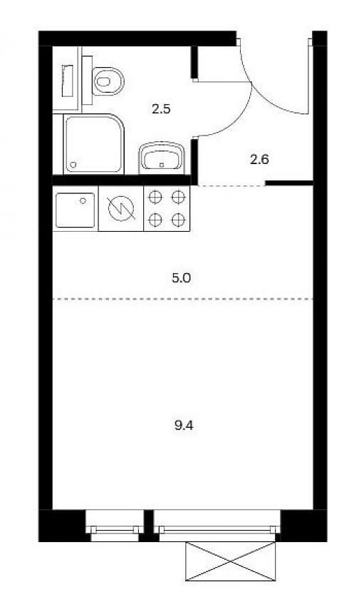 Студии спроектированы без изысков. Входная зона площадью от 2,6 кв.м., совмещенный санузел площадью 2,5 кв.м. (без вариантов), универсальное помещение площадью от 14,4 до 18,1 кв.м. И корзины для кондиционеров за окном.
