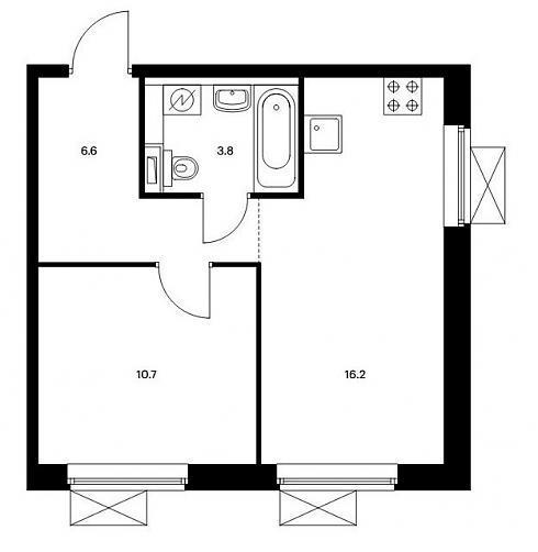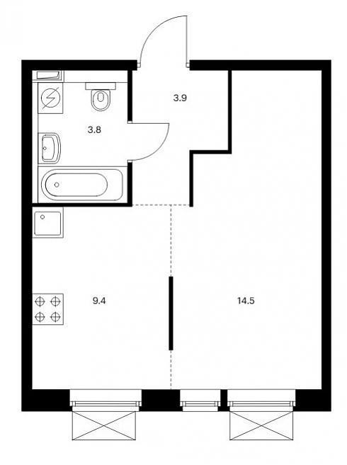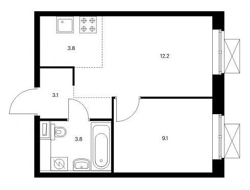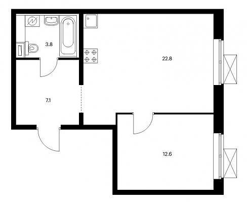 Однокомнатные квартиры спроектированы в классическом формате, но с одной оговоркой: стена между кухней и спальней не всегда сплошная. То есть, с намеком на евростандарты. В остальном все, как обычно. Входная зона площадью от 3,9 до 7,1 кв.м., совмещенный санузел площадью 3,8 кв.м. (без вариантов), кухня площадью от 9,4 до 22,8 кв.м., спальня площадью от 12,6 до 14,5 кв.м. Расположение комнат встречается как одностороннее, так и угловое, в одной комнате может быть два окна.