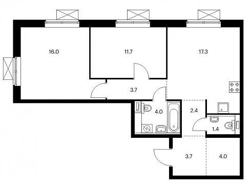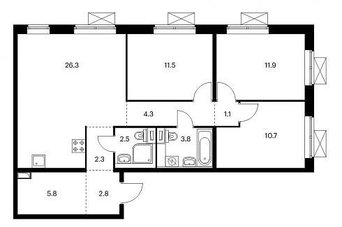 В трехкомнатной квартире обнаруживаем входную зону площадью 10,9 кв.м. (с учетом внутренних коридоров площадь входной зоны увеличивается еще на 5,4 кв.м.), два санузла с площадью помещений 2,5 и 3,8 кв.м., кухня площадью 26,3 кв.м. и три спальни площадью от 10,7 до 11,9 кв.м. Расположение комнат угловое.