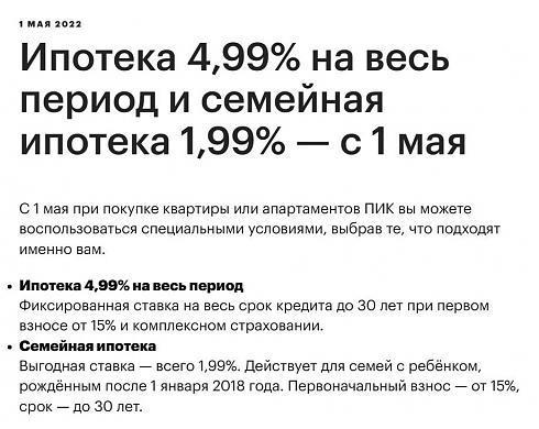 ГК ПИК, как крупнейший застройщик, сотрудничает с большим количеством ведущих российских банков и благодаря этому предлагает своим покупателям весьма выгодные условия ипотечного кредитования. Например, семейную ипотеку под 1,99% годовых.