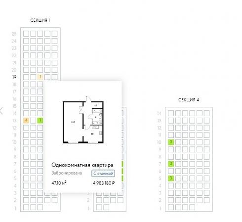 При клике на выбранный корпус открывается шахматка с доступными для покупки вариантами, при клике на вариант – планировка и описание квартиры.