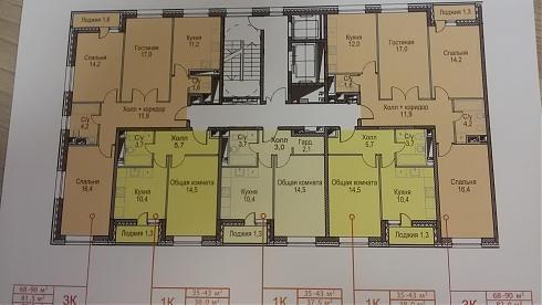 Как я уже говорила, внутри квартир нет ни колон ни несущих стен. Газосиликатными блоками обозначена только лоджия, причем эти блоки тоже можно убрать, расширив пространство. Но стоит учитывать, что потребуется, например, возведение межкомнатных стен, а это немалые затраты. Межквартирные перегородки – также из газосиликата. То есть, если Вы покупаете две квартиры в секции, можете, без ущерба для дома, убрать стены, разделяющие жилплощади. На площадке – 4-5 квартир. Апартаменты также сдаются в свободной планировке, на этаже их от 6 до 8.