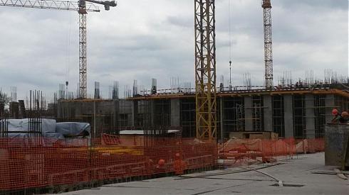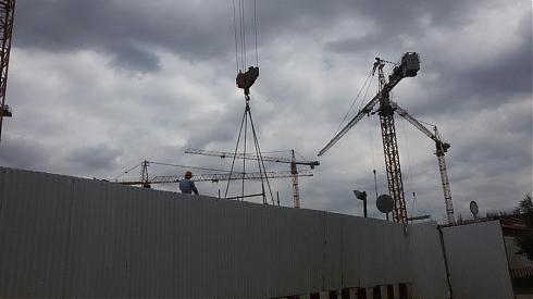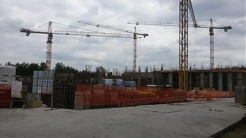 Сейчас на площадке работает одновременно около десятка башенных кранов. И на мой уточняющий вопрос – действительно ли стены монолитные, рабочий указал на нижний ярус металлического каркаса, куда заливался бетон.