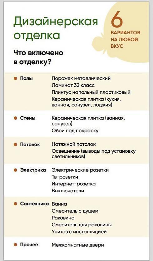 Чистовая отделка предлагается в шести стилях: «светлая классика», «темная классика», «морской бриз», «теплый песок», «утро в саду» и «вечер на террасе».