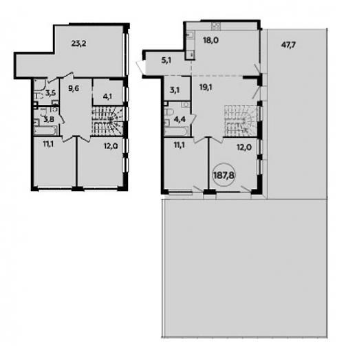 В двухэтажной пятикомнатной квартире запроектирована входная зона площадью 17,8 кв.м. (с учетом второго этажа), три санузла с площадью помещений от 3,5 до 5,8 кв.м., кухня площадью 37,0 кв.м., четыре спальни площадью от 11,0 до 23,3 кв.м., терраса площадью 47,7 кв.м. Расположение комнат угловое, встречаются комнаты с двумя окнами.