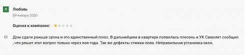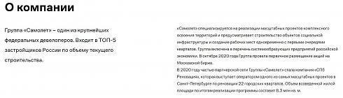 А это значит, что покупатель будет иметь дело с ответственным и надежным партнером, который не позволит себе нарушать сроки строительства или выпускать бракованную продукцию. По информации отдела продаж, единственный случай, когда «Самолет» нарушил сроки строительства объектов, случился во время ограничения трудовой деятельности во время пандемии. Речь идет об одном - двух месяцах.