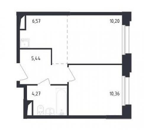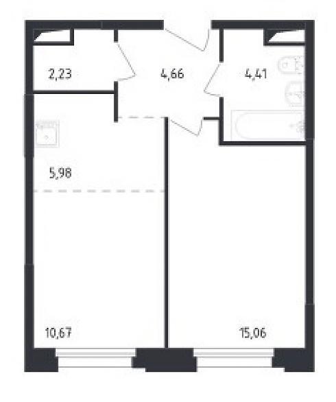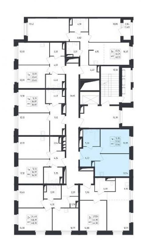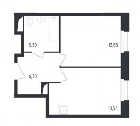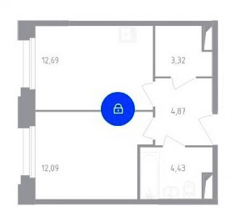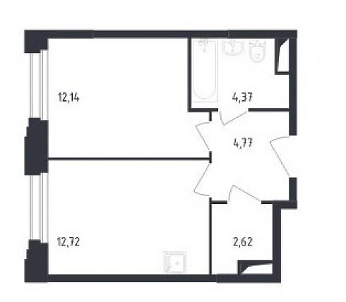 В однокомнатных квартирах все скромно. Входная зона площадью от 4,72 до 4,87 кв.м., совмещенный санузел площадью от 4,37 до 5,2 кв.м., кухня от 12,32 до 13,54, спальня чуть более 12 кв.м. Но есть и приятные сюрпризы: в отдельных вариантах планировок встречаются кладовые 3,32 кв.м.