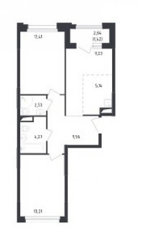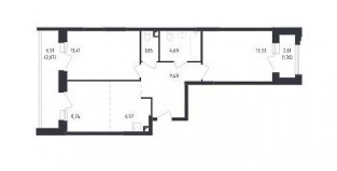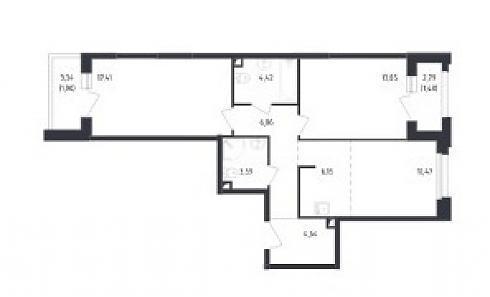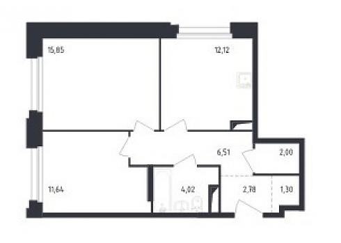 Часть двухкомнатных квартир запроектирована по стандартам евро и поэтому почти ничем не отличается по планировке от классических «однушек». Входные зоны площадью от 4,46 до 5,44 кв.м., совмещенные санузлы около 4,5 кв.м., кухни - спальни общей площадью около 17 кв.м. и просто спальни от 10,36 до 15,06 кв.м. А вот классическая «двушка» интереснее. Входная зона площадью более 10 кв.м. включает в себя прихожую, коридор и место для платяного шкафа. Тут же рядом гардеробная площадью 2,1 кв.м. Совмещенный санузел 4,12 кв.м., кухня 12,12 кв.м., две спальни 11, 64 и 15,85 кв.м.