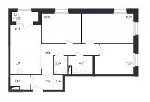 Трехкомнатные квартиры запроектированы в евроформате и «классике». Здесь мы имеем входные зоны площадью от 9,49 до 13,1 (если считать вместе с внутренним коридором), два санузла площадью от 1,57 до 4,7 кв.м. и либо кухню-гостиную суммарной площадью до 15 кв.м., либо просто кухню размером более 20 кв.м., если речь идет о классической планировке. Спальни от 12,21 до 13,4 кв.м., встречается одна или даже две лоджии площадью 2,84 кв.м. Бывает и балкон площадью почти 9 кв.м. с выходом из спальни и кухни.