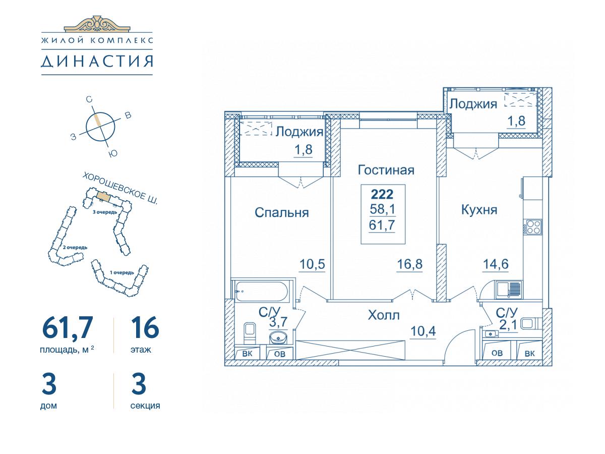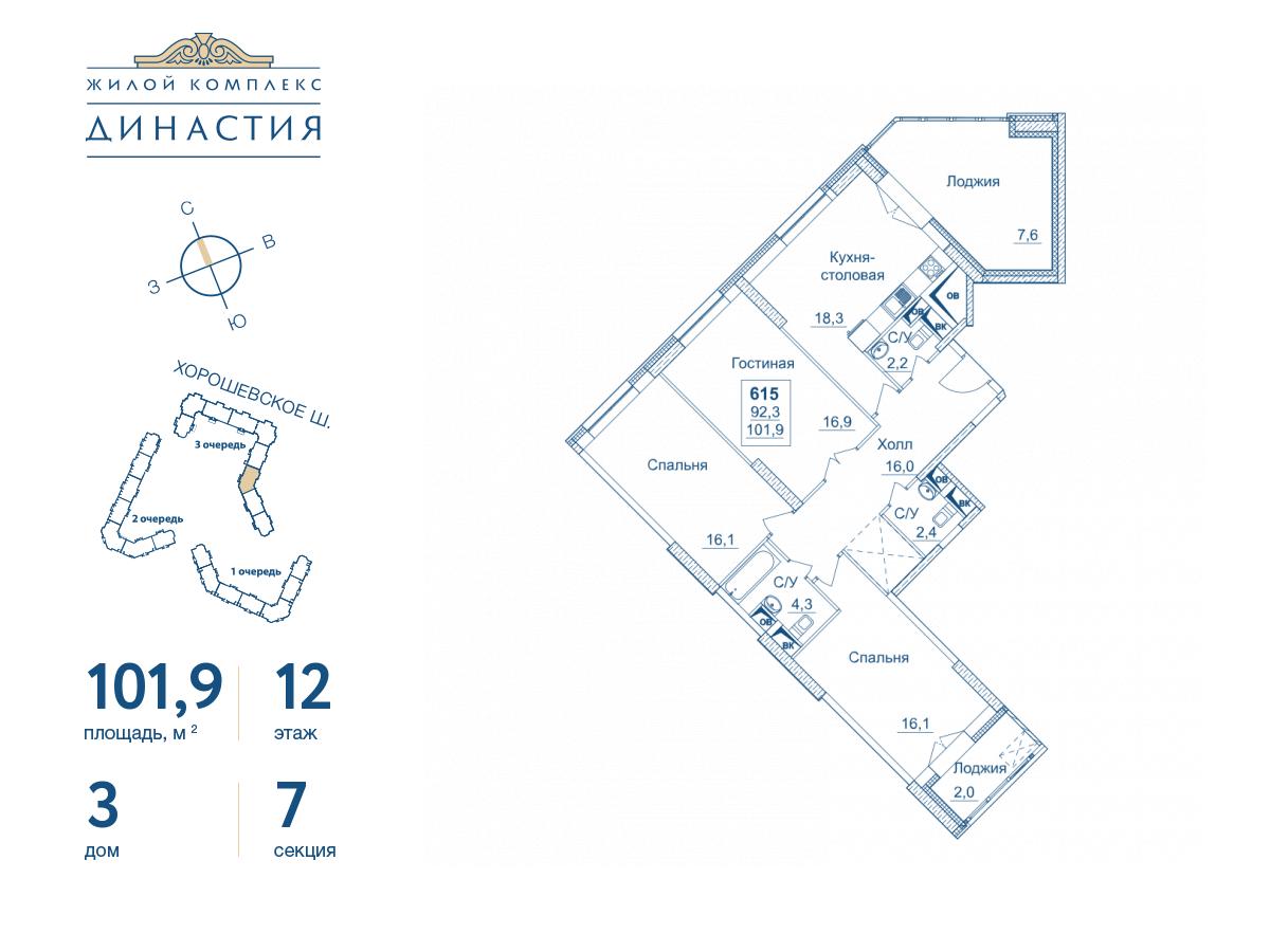 Трёхкомнатных три варианта от 79 и до 103 метров. Две распашонки и окна торцевая с 8 окнами. Самая большая с нестандартной геометрией, так как находится в месте, где дом поворачивает. Примечательна она наличием двух больших лоджий, трех санузлов и двух комнат неопознанной формы.
