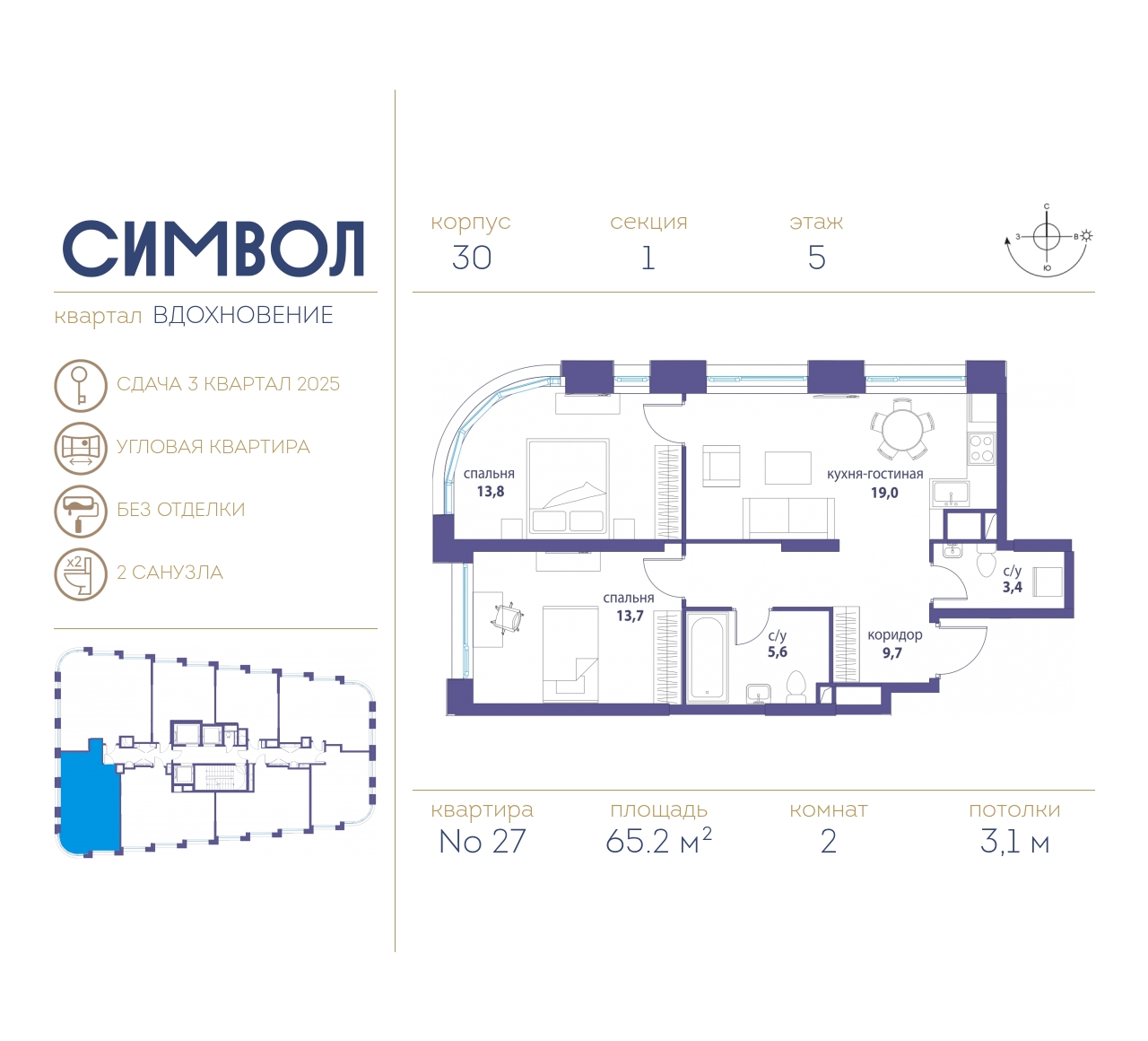 | Февраль 2023 | 33,5-56,6 м2 | 14 296 626 - 24 104 500 ₽ | ~431 473 ₽ | 0.12% |