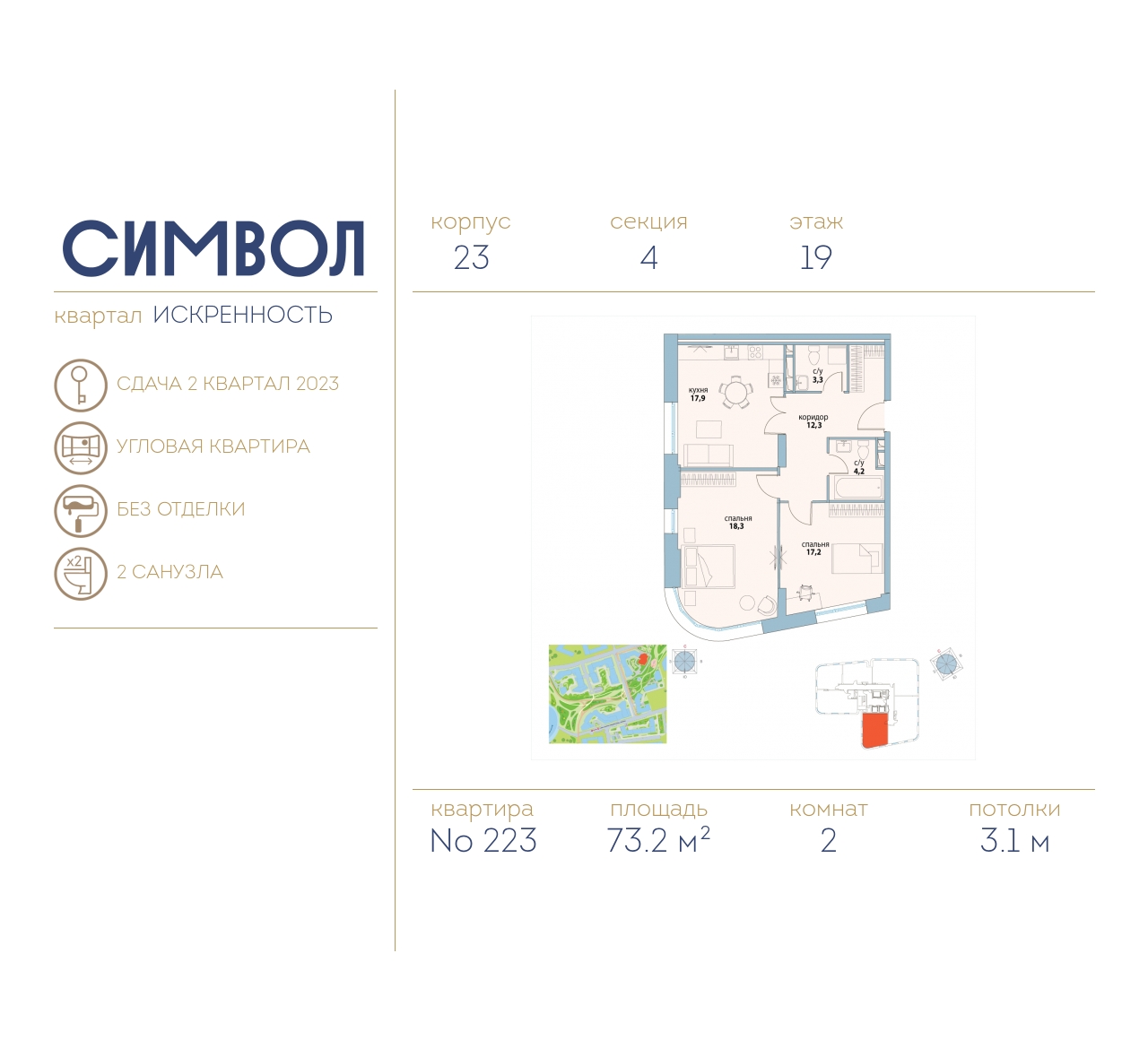 | Апрель 2023 | 92,4-123,8 м2 | 34 925 820 - 58 271 400 ₽ | ~433 475 ₽ | 7.94% |