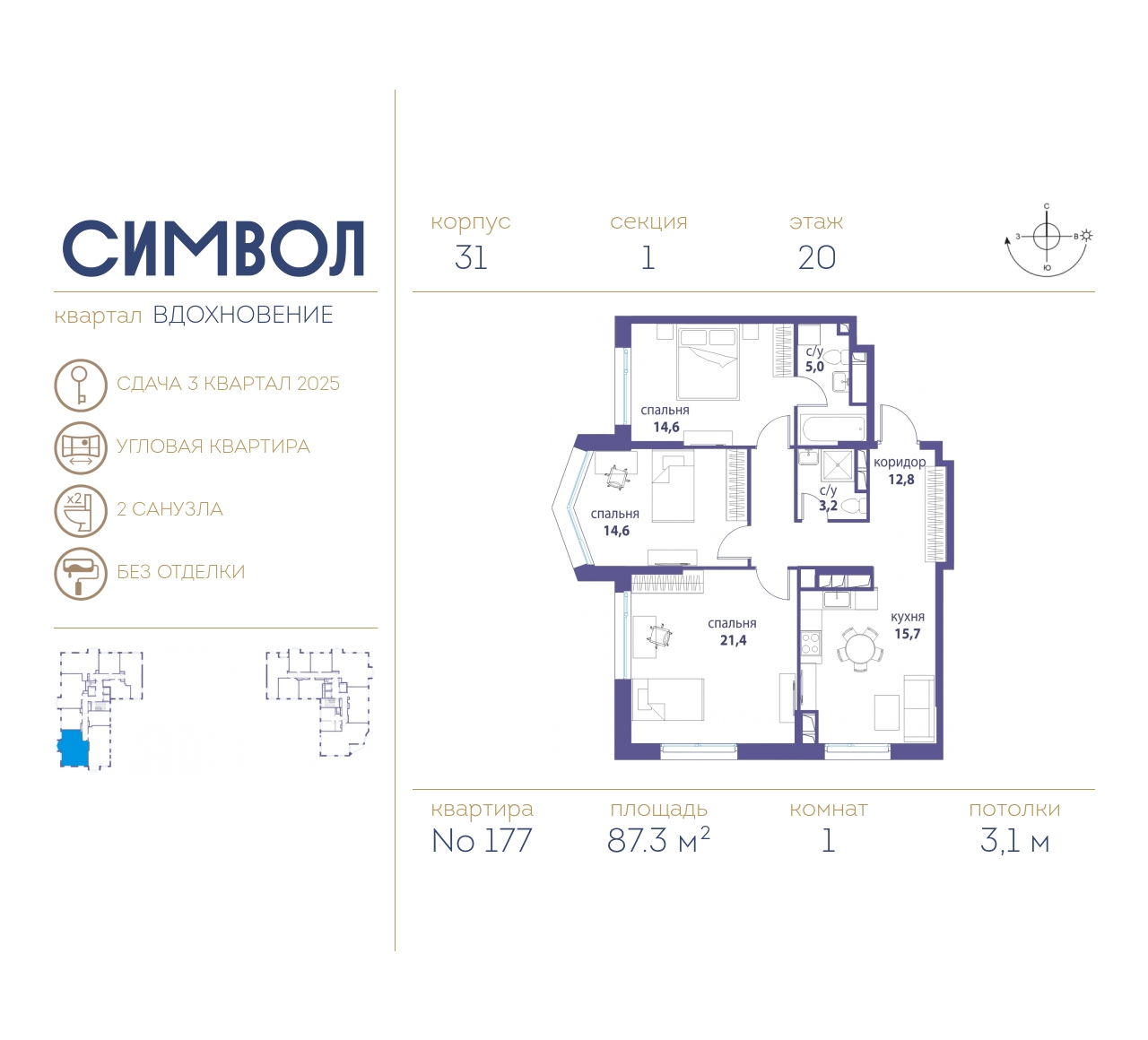 | Август 2020 | 89,3-119,5 м2 | 19 899 250 - 33 402 078 ₽ | ~256 256 ₽ | 8.19% |