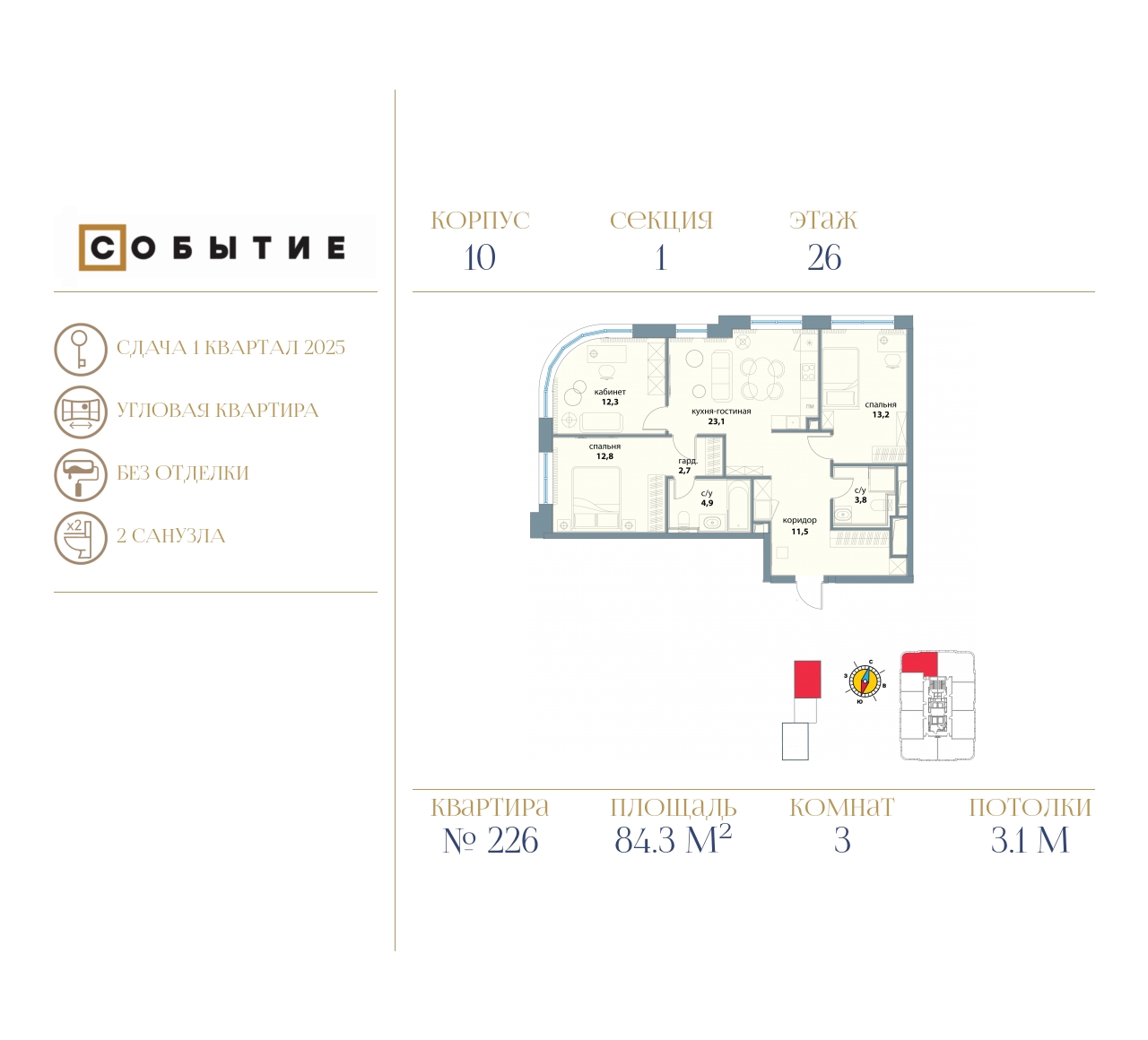 Ноябрь 2023 106.8-170.1 м2 25 084 116 - 94 370 000  ₽ ~431 398  ₽  -19.93%