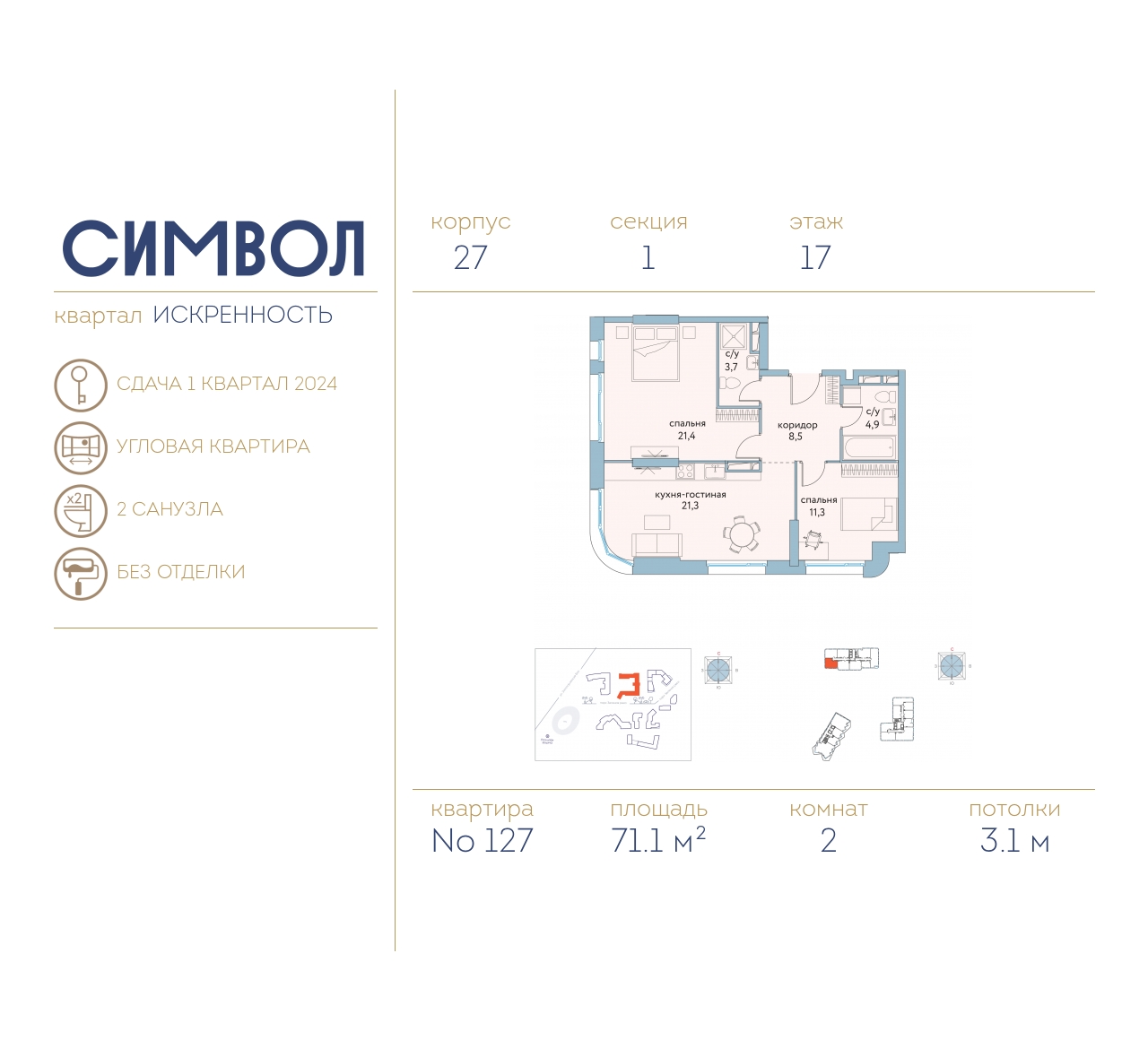| Март 2024 | 27.1-42.4 м2 | 9 307 116 - 17 080 000 ₽ | ~379 671 ₽ | -2.98% |