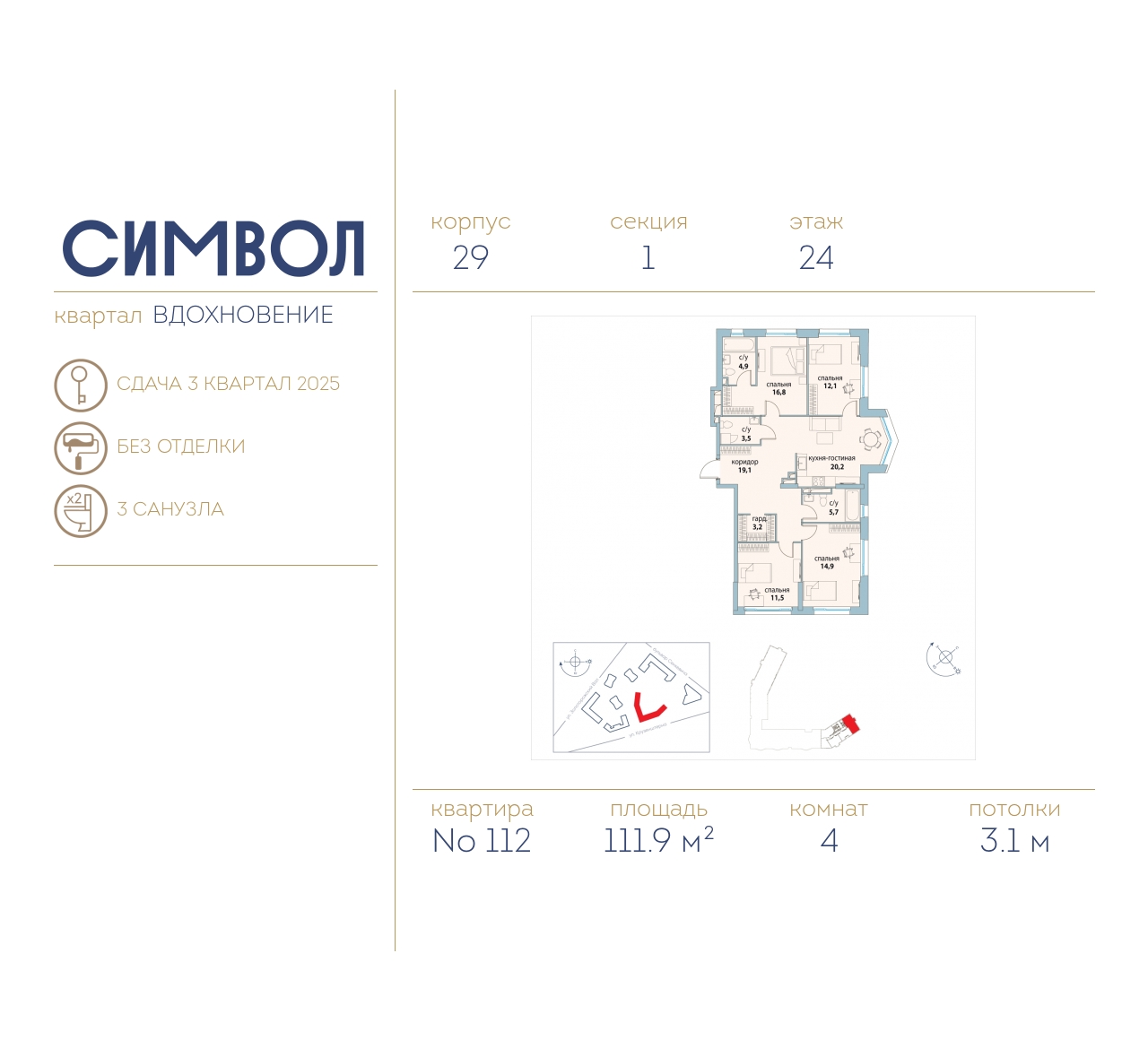 | Апрель 2023 | 92,4-123,8 м2 | 34 925 820 - 58 271 400 ₽ | ~433 475 ₽ | 7.94% |