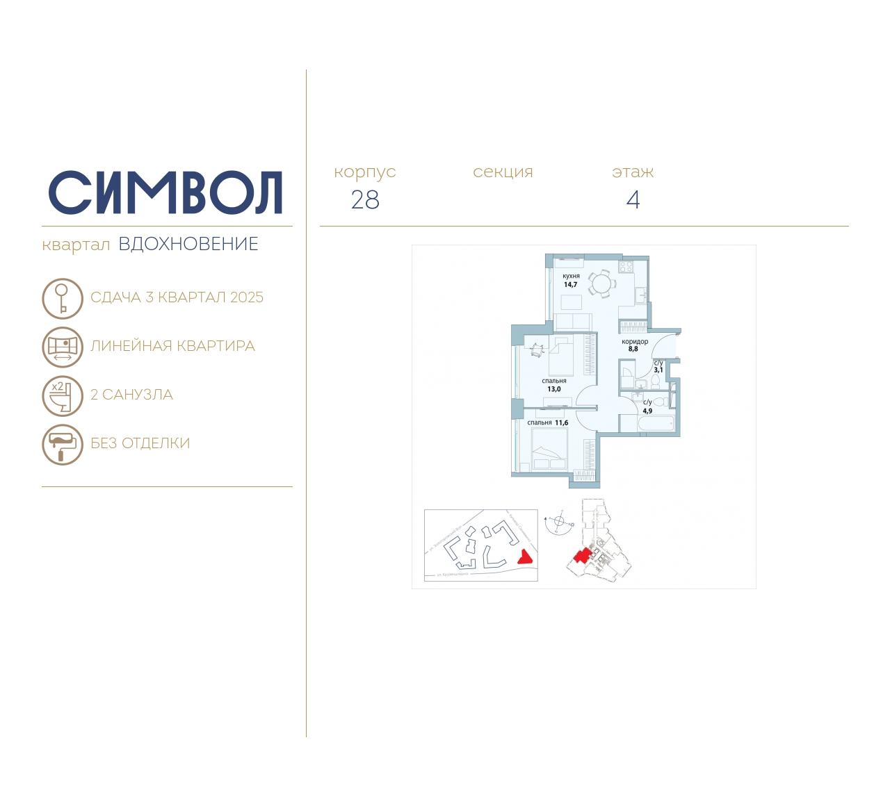 | Сентябрь 2022 | 33,5-56,6 м2 | 13 678 050 - 24 104 500 ₽ | ~424 523 ₽ | 2.95% |