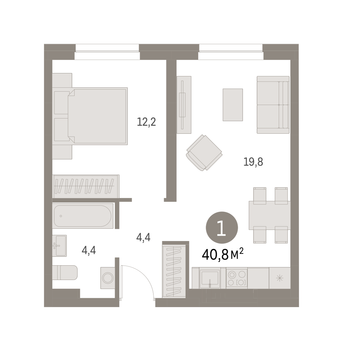 В квартиру проведено электричество, установлен щиток и произведена разводка. Установлены выключатели, розетки, трубка домофона. Здесь подсказка, что это однокомнатная квартира площадью 40,4 кв. м с совмещенной кухней-гостиной и небольшой спальней.