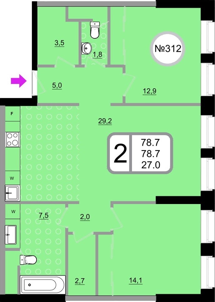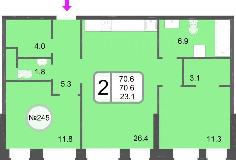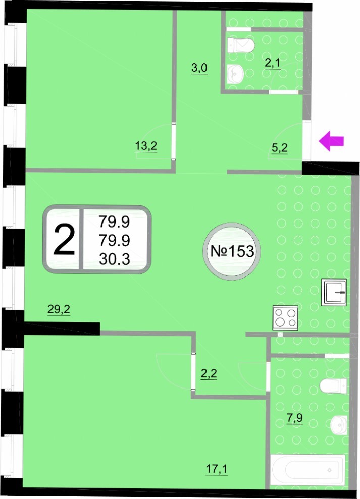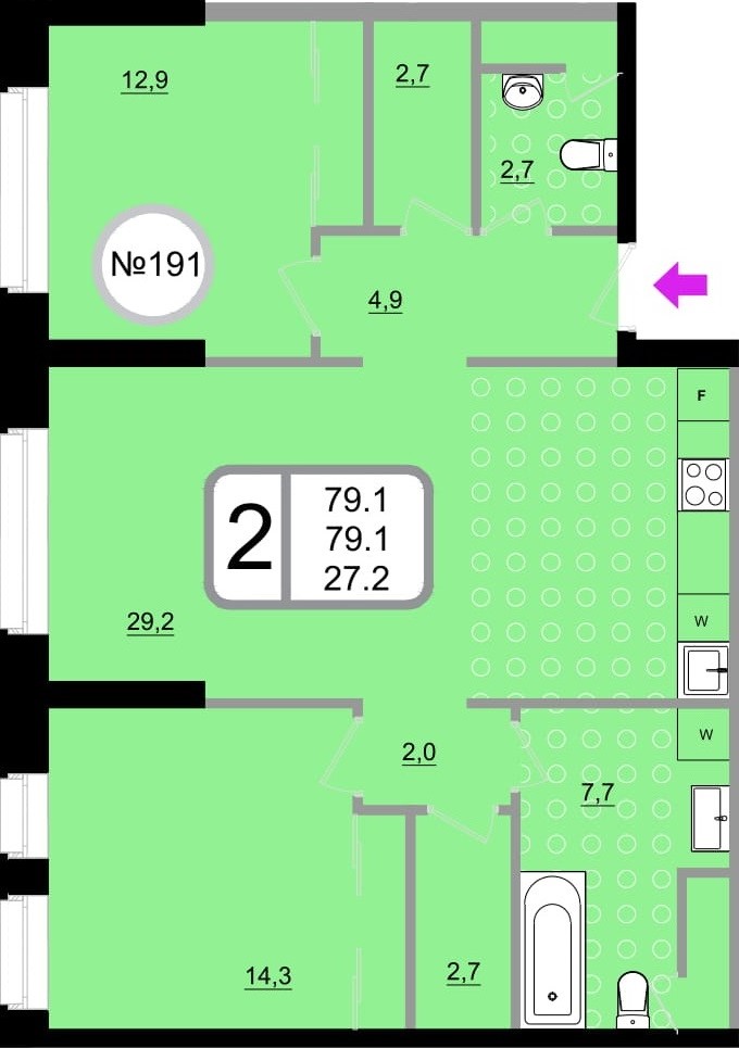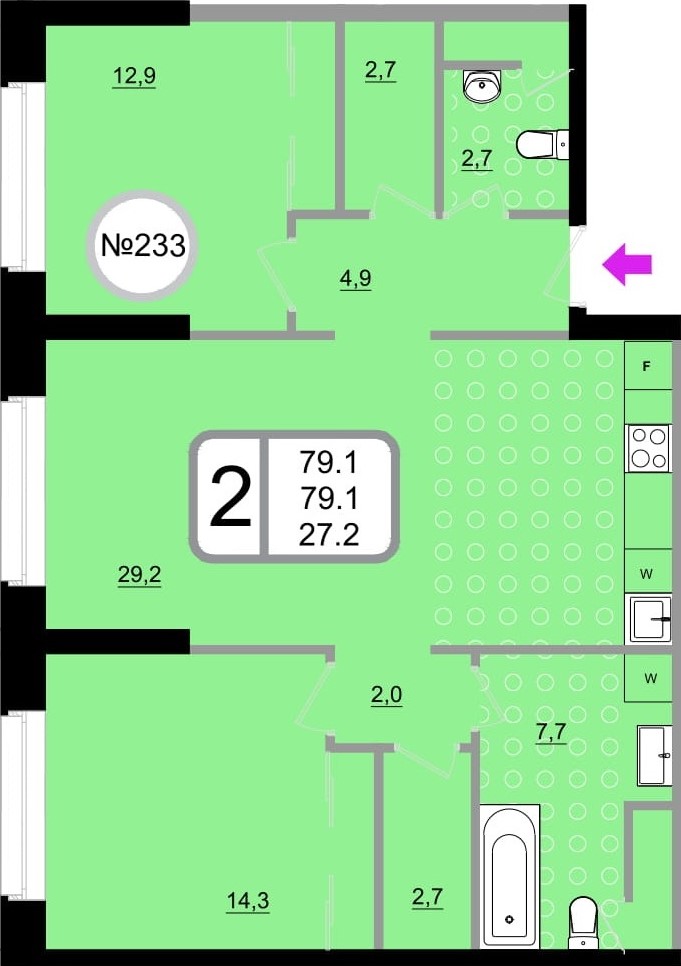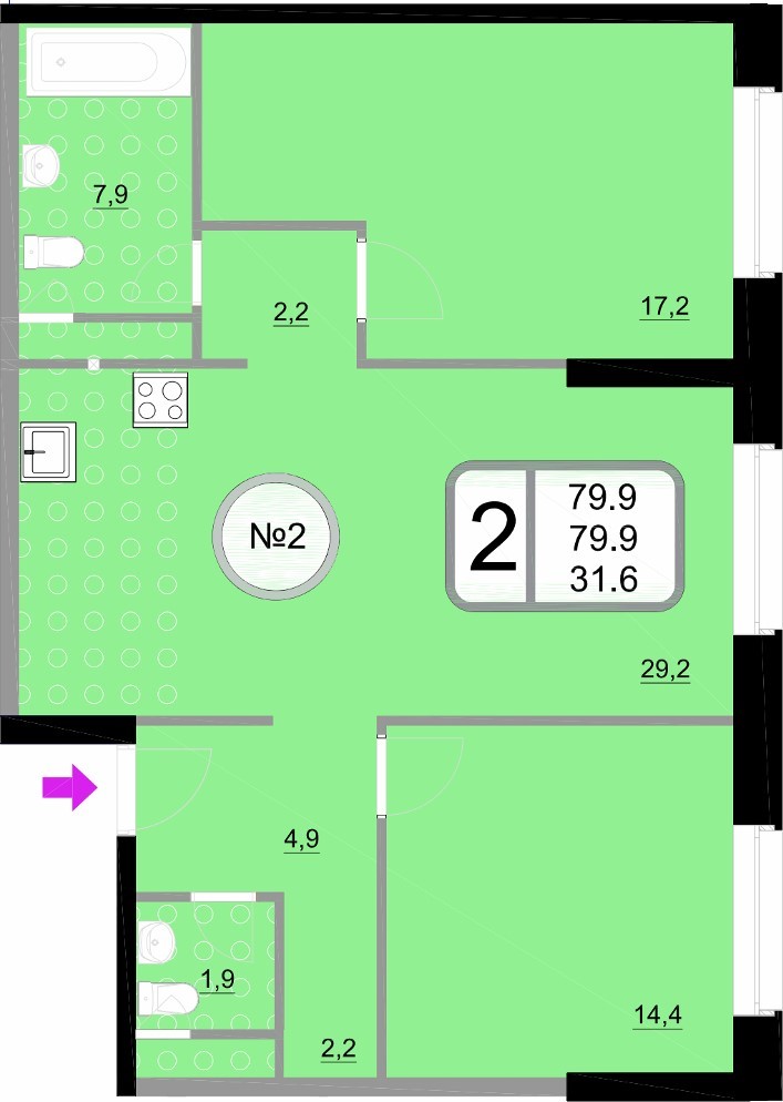 Двухкомнатные – от 57 до 76 кв. м.